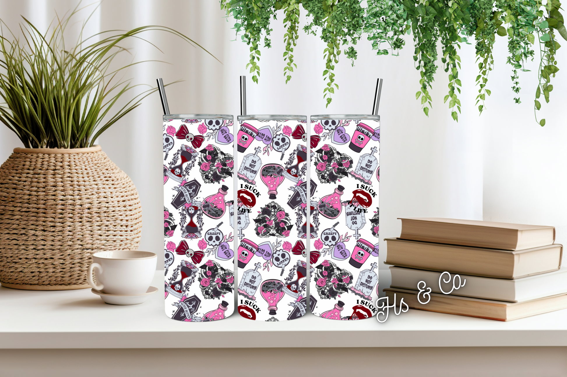 Our tumblers are 20oz stainless steel double walled which allows your drinks to keep cool or hot for up to 12 hours! They come with a straw and lid.