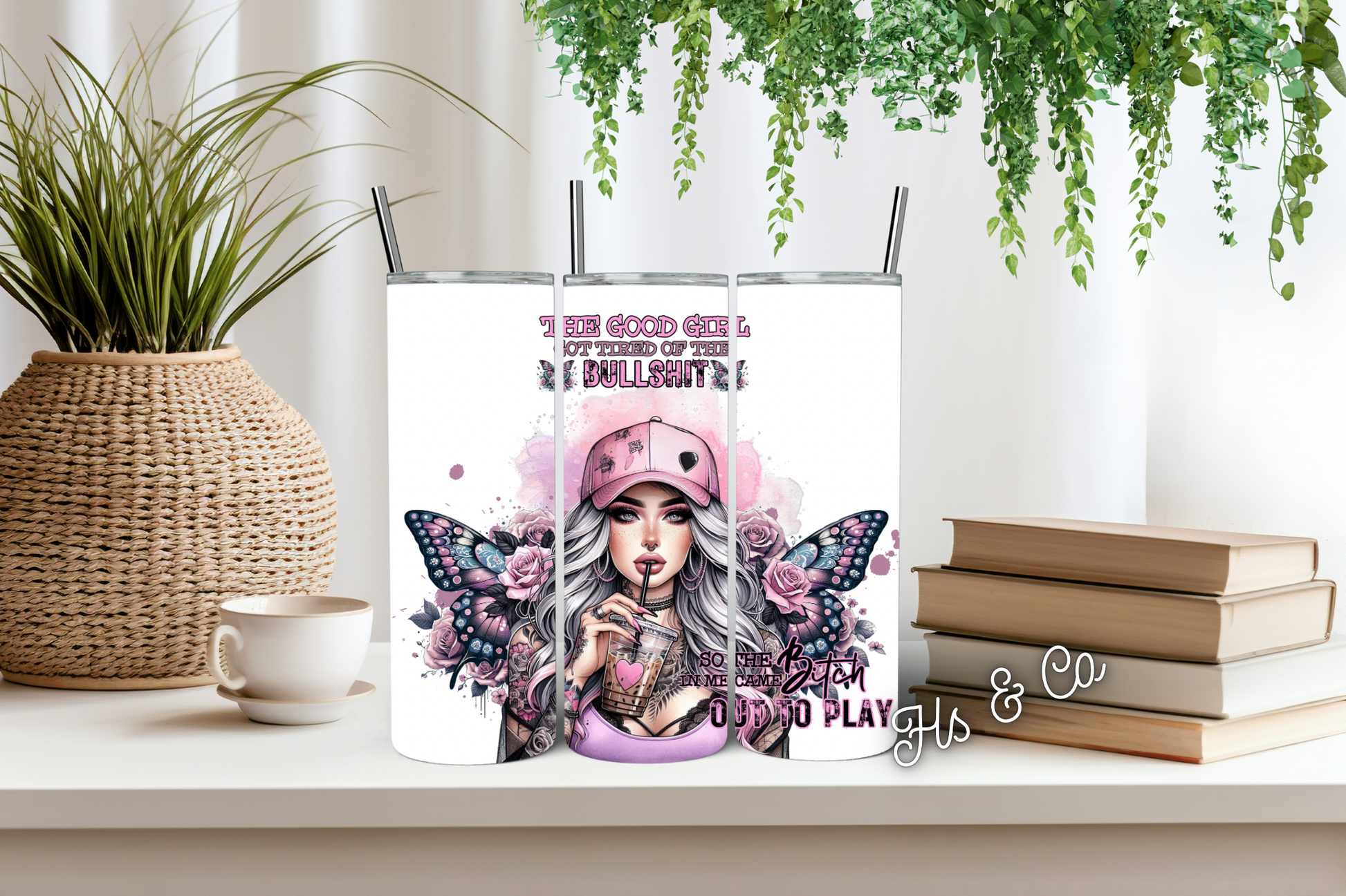 Our tumblers are 20oz stainless steel double walled which allows your drinks to keep cool or hot for up to 12 hours! They come with a straw and lid.