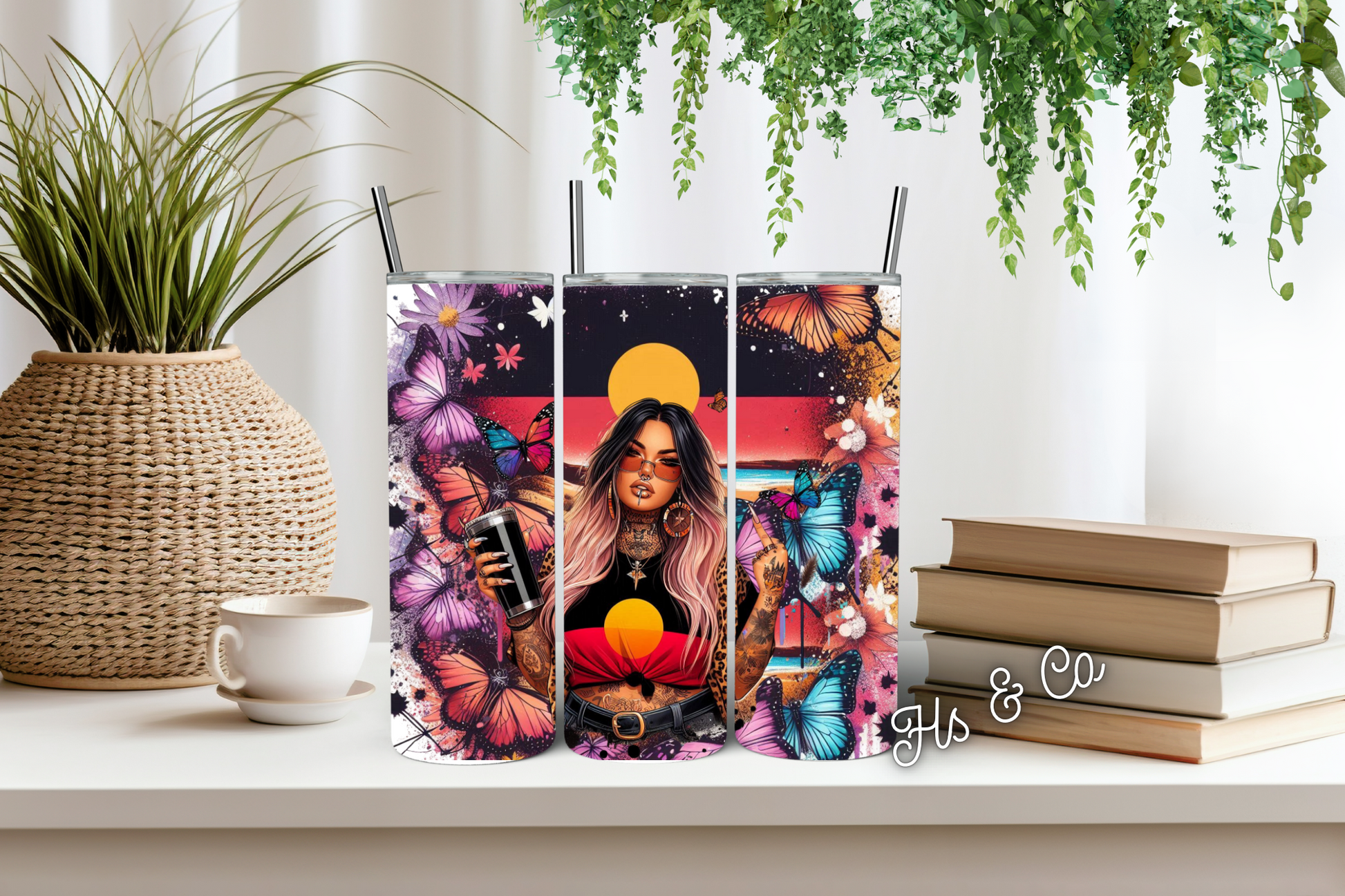 Our tumblers are 20oz stainless steel double walled which allows your drinks to keep cool or hot for up to 12 hours! They come with a straw and lid.